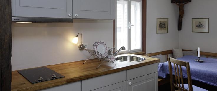 Wohnraum integriert ist die Küchenzeile mit einem 2-Platten-Ceran-Kochfeld