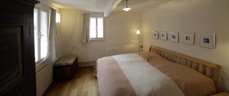 Über den Flur mit einem kleinen Arbeitsplatz erreicht man das Schlafzimmer mit Doppelbett (1,80 m x 2,00 m). Die Fachwerkwand des Nordgiebels ist hier innenseitig sichtig. Die Kleidung findet Platz in einem historischen Bauernschrank von 1847.