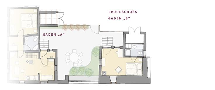 Im Grundriss ist links noch Gaden A angedeutet, da Gaden B nur als Erweiterung zu Gaden A gemietet werden kann. Nur so ist die Intimität der Anlage mit dem zwischengeschalteten Garten gewährleistet.